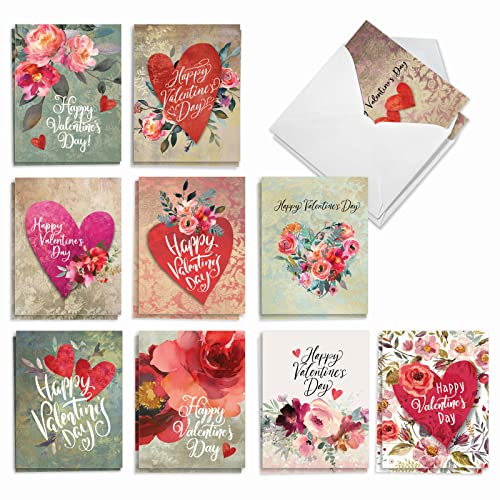 The Best Card Company 20 Assorted Valentine's Day Note Cards Bulk Box Set 4 x 5.12 Inch with Envelopes (10 Designs, 2 Each) Hearts and Flowers AM10413VDG-B2x10