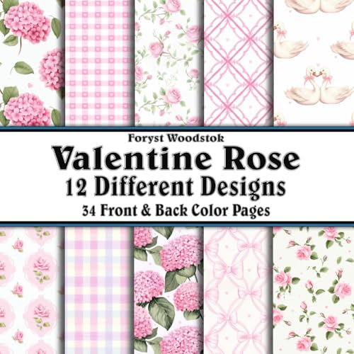 Scrapbook Paper - 34 Front and Back Full Color Sheets: Valentine Rose & Hydrangea Patterns - Spring Swans Flowers Hearts Pink Plaids Dots and Love - 8.5"x8.5"