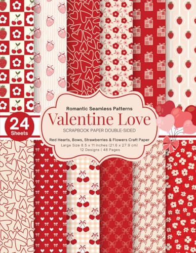 Valentine Love Scrapbook Paper: Double-Sided Red & Pink Hearts, Bows, Strawberries & Flowers | Romantic Seamless Patterns | 8.5 x 11 Craft Paper for Cards & DIY