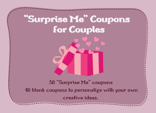 “Surprise Me” Coupons for Couples: 30 “Surprise Me” coupons and 10 blank coupons to personalize with your own creative ideas. Valentine's Gift for Him ... Girlfriend, Wife, Husband, Men, Women.
