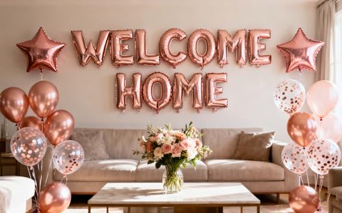 Välkommen hembanderoll hembrev ballong med stjärnballonger paljetter för välkommen hem familj hemfestdekorationer (förpackning med 24 st, roséguld)