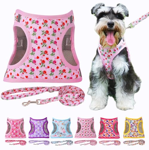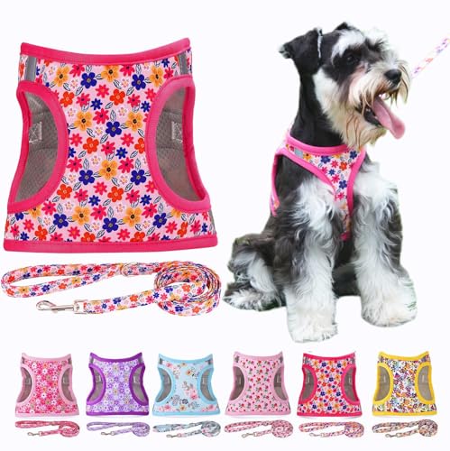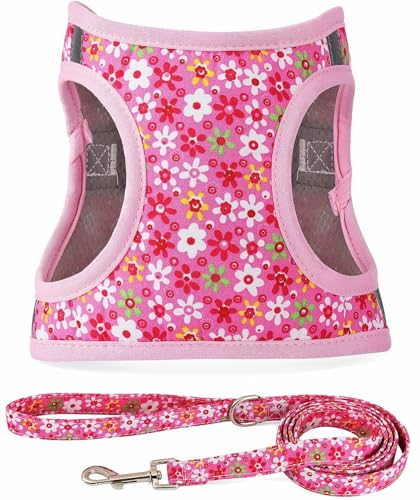 Moonpet Step in Air hundsele koppel set – alla väder reflekterande icke-dragande blommönster vadderad nätväst sele för katter valp extra små medelstora hundar – rosa blomma – S