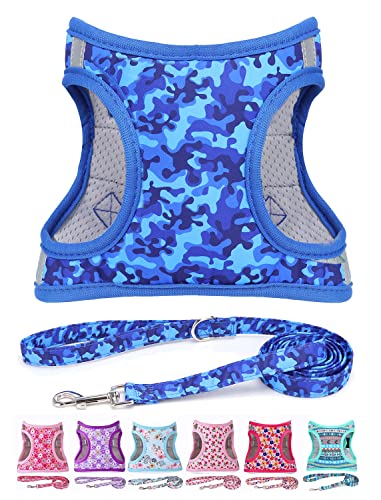 Moonpet Step in Air Boy hundsele koppel set – alla väder reflekterande icke-dragande vadderad nätväst sele för katter valp extra små medelstora hundar – blå kamouflage – XXS