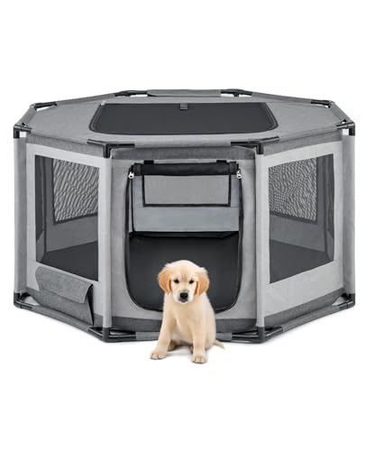 lionto Valphage i oxfordtyg, andningsbart nät med dragkedja & sidoficka, utehage för hundar & katter med PVC-ram, åttakantig hundbur, 112x112x62 cm, grå
