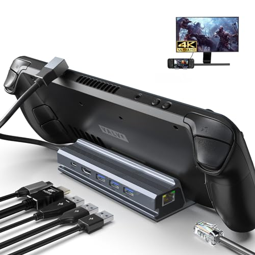 Steam Deck Dock – 6-i-1-dockningsstation med HDMI, USB-C, USB 3.0, Gigabit Ethernet – kompatibla tillbehör för Valve Steam Deck – bärbar dockningsstation för spel och streaming