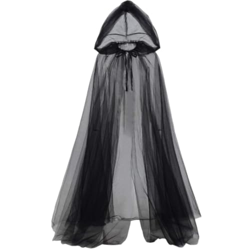CABODYALS Svart älvkappa med huva lång polyester hård vampyr halloween cape gotisk spöke ren tyll siden häxa huva bröllopsklänning rock för kvinnor brud cosplay fest kostym tillbehör