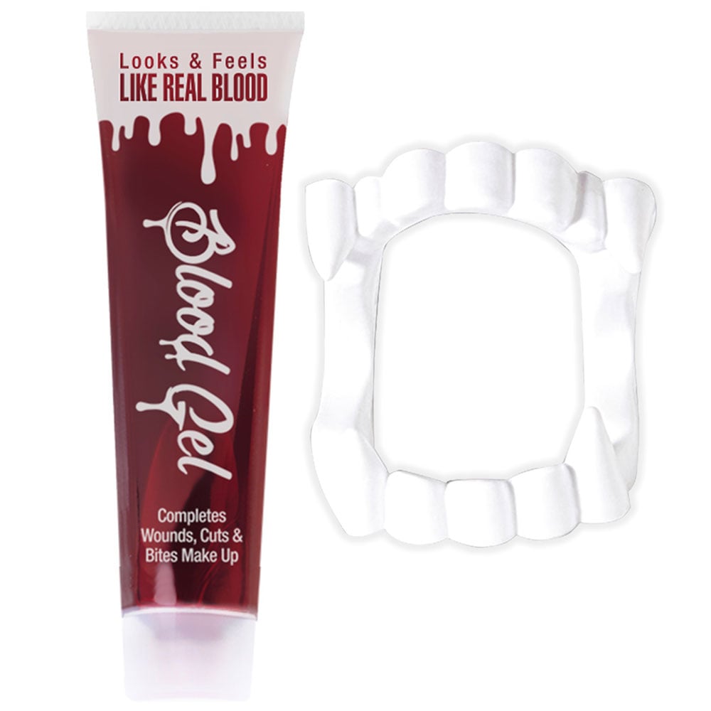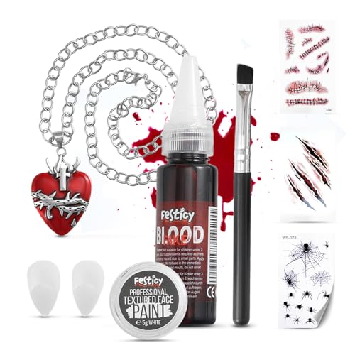 Festicy Vampyr-tillbehör 2025 Set I Halloween fejkblod, vampyrtänder, tatueringar, vit ansiktsfärg med pensel och halsband I Vampyraccessoarer för kvinnor som Halloween-dekoration för barn och vuxna