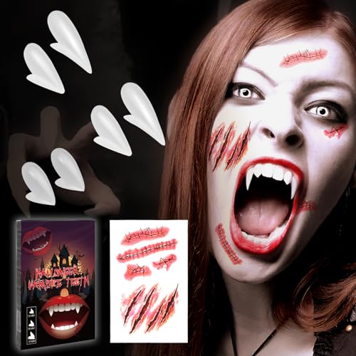 4 par vampyrfångssats, vampire cosplay fångare, 4 storlekar anpassade vampyrtänder med 1 rör tänder pellets lim, falska tandprotes med 20 tillfälliga ärr, tatueringar, klistermärken för karneval,