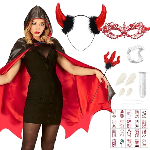 Hendpock Djävul kostym kvinnor, halloween vampyr kappa svart röd cape död häxa kappa med djävulsgaffel djävulshorn tillfällig tatuering vampyrtänder karnevalkostymer för karneval maskerad cosplay