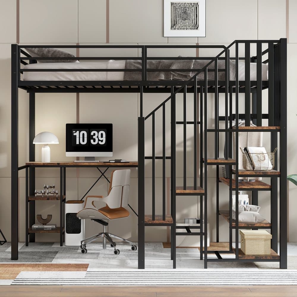Våningssäng i metall för barn och tonåringar, med hörnstege, skrivbord, öppet klädskåp och hyllor, järn+MDF, svart+vintage trä, 120x200 cm