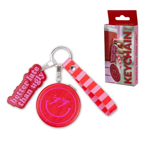 Fisura – Rosa och röd nyckelring i metall "better late than ugly” med spegel, damnyckelring med originell design, perfekt gåva till födelsedag, mors dag eller väninna