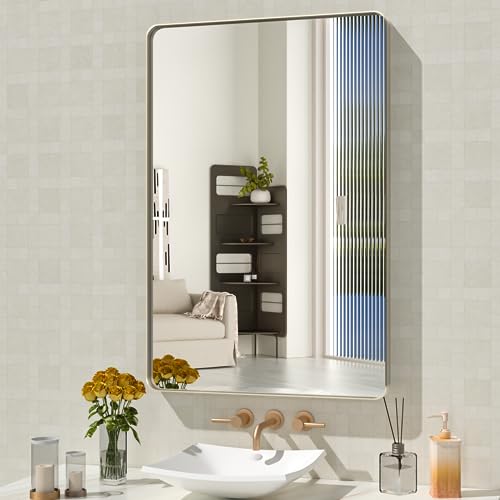 WEER 24X36 Inch Brushed Nickel Bathroom Mirror, Brushed Silver Metal Frame Mirror, Rounded Rectangle Silver Bathroom Vanity Mirror, Tempered Glass, Anti-Rust, Hangs Horizontally or Vertically