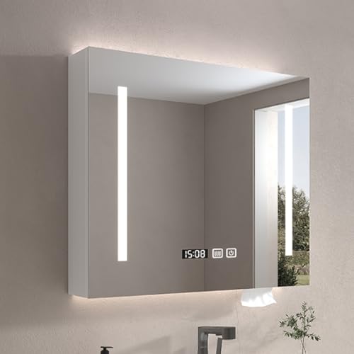 LIDANGUH Wooden Anti Fog Bathroom Mirror Cabinet with Light, Three-Color Light, Vanity Mirror with Storage, Time and Temperature, Paper Hole, 60*13*70cm/23.6*5.1*27.6in, White
