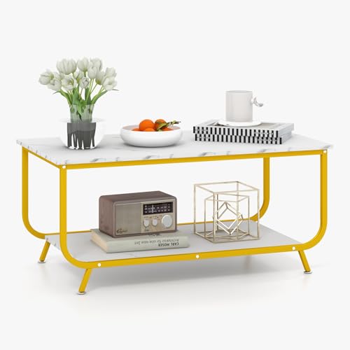 LIFEZEAL Soffbord med marmorutseende, soffbord med stort öppet lagringsutrymme, Rektangulärt vardagsrum bord med metallram, 105 x 55 x 46,5 cm (Vit), PD98195JSDE