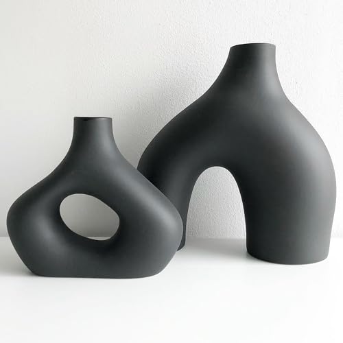 Svart vaser heminredning, set med 2 stora svarta vaser, svart keramisk vas, boho-vas, dekorativ vas, modern bondgårdsdekor, hög matt svart vas för vardagsrum, hylla, mantel, bord, öppen spis dekor