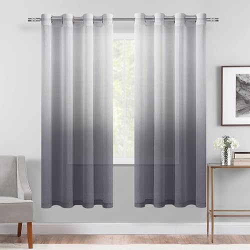 DWCN Faux linne grå ombre genomskinliga gardiner – tonade halvvoile draperier sovrum och vardagsrum gardiner, set med 2 öljett topp fönstergardiner, 132 x 150 cm längd
