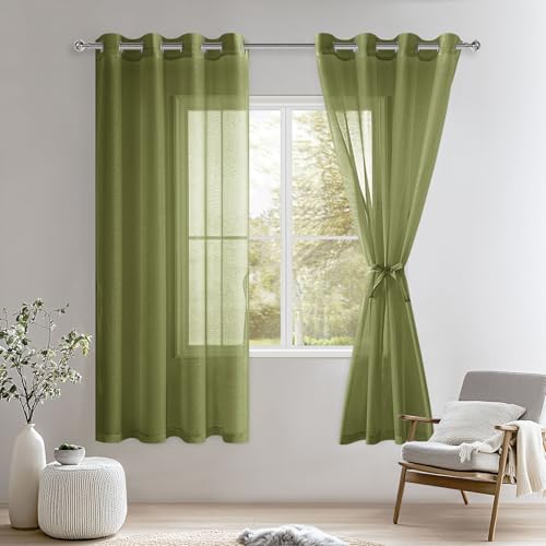 DWCN Gardiner med öljetter sheer voile gardiner transparenta gardiner, vardagsrum sovrum gardiner, olivgrön, 225 x 140 cm (H x B), set om 2