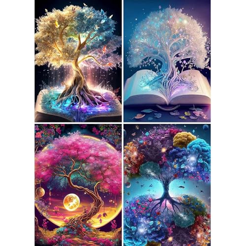 Eviznbou Komplett set 4 st 5D diamantmålning - trädbilder med gör-det-själv-tillbehör för vardagsrum, sovrum, kontor, vägg och entré