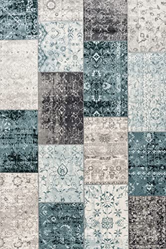 Vimoda designer modern vardagsrumsmatta i turkos, grå och vit med kakelutseende, kort lugg, mått: 80 x 150 cm