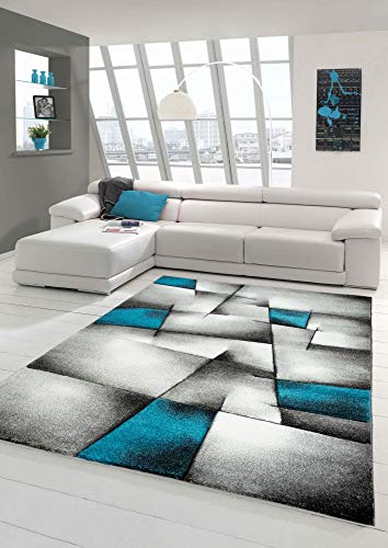 VIMODA Designer modern vardagsrumsmatta i turkos, grå och vit med kakelutseende kort lugg, mått: 120 x 170 cm