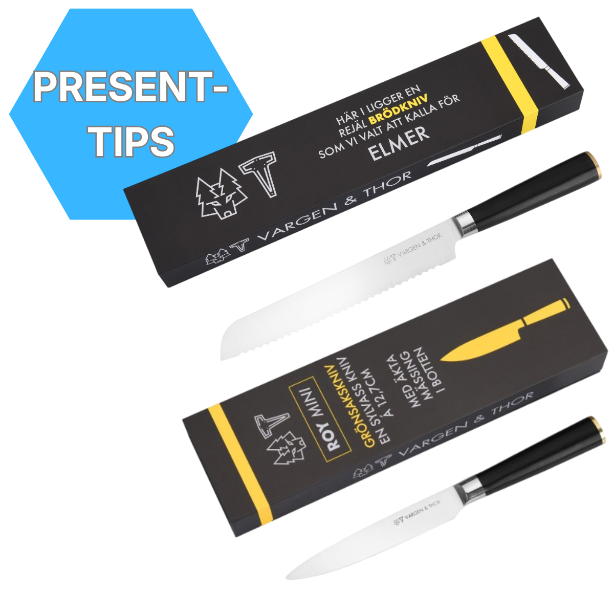 Vargen & Thor Knivpaket ELMER Brödkniv 21 cm + ROY Mini Allkniv 12,7 cm. Matt svart + mässing. Fri frakt. - 2 års garanti