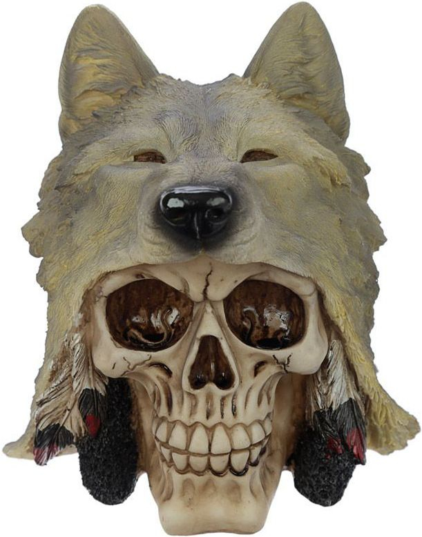 Goth, skalle och steampunk skalle med varghuvud dekoration, polyresine, multi, höjd 13,5 cm bredd 15 cm djup 15,5 cm