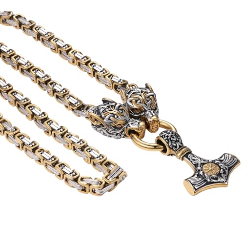 Lykka Viking stålhalsband Tors hammare guld-silver med varghuvud 60 cm