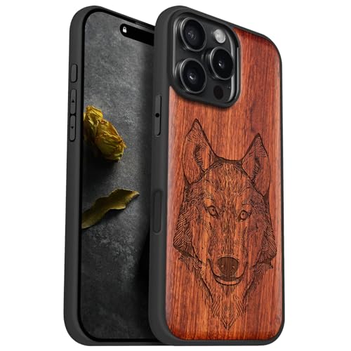 Carveit Träfodral för iPhone 16 Pro Max Case [Naturligt trä & svart mjuk TPU] premium Stötsäkert Bumper Hybridfodral kompatibelt med iPhone 16 Pro Max fodral (Reste sig-Varghuvud)