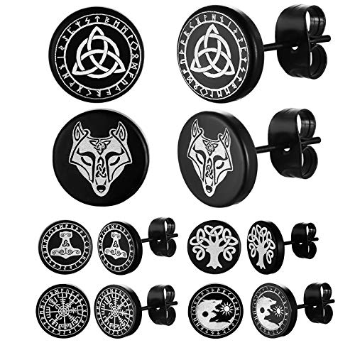 FaithHeart nordiska vikingaörhängen studs rostfritt stål varghuvud/Tors hammare/kompass/valknut öronsmycken punk örhänge set för män kvinnor, Rostfritt stål, Ingen ädelsten