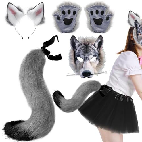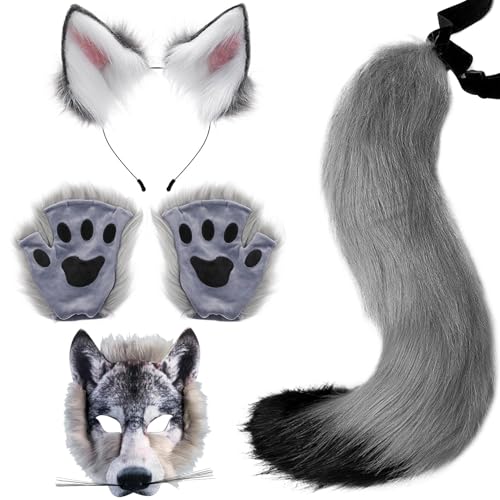 Yaoliucp Vargmask med vargtassar och vargöron och svans set realistisk lurvig varg kostym gör-det-själv dekorativa kostymer för halloween maskerad cosplay, vargdräkt