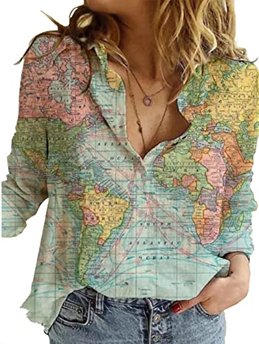 Dam världskarta 3D-tryck t-shirt, ledig lös knapp upp framblus skjorta v-ringad kortärmad ledig topp, Ljusgrön karta, 3XL