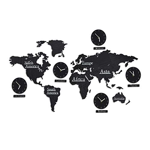 Relaxdays Världskarta trä med 5 klockor, 10 stadsskyltar, 3D-karta värld, med stencil, H x B: 61 x 113 cm, svart, 1 st