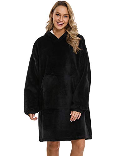 Sykooria Överdimensionerad huvtröja sweatshirt filt, dubbla lager fluffig sherpa huvtröja filt sweatshirt, supermjuk varm bärbar filt för kvinnor män vuxna barn, Svart, M