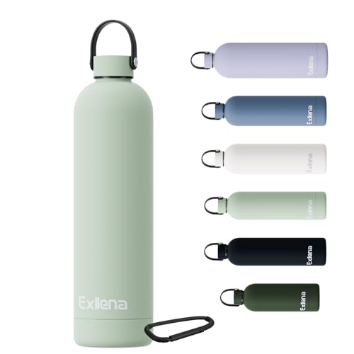 Exllena Isolerade vattenflaskor med handtag och klämma, dubbel vägg vakuumdrycker flaska håller drycker kalla 24 timmar/varm 12 timmar, rostfritt stål vattenflaska BPA-fri (citrongrön, 1 000 ml)