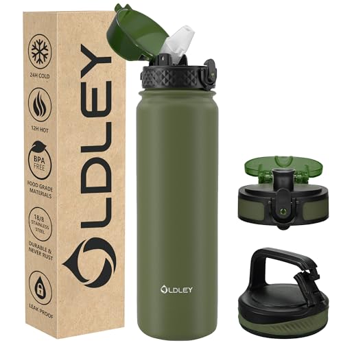 OLDLEY Vattenflaska i rostfritt stål med sugrör 1 l, isolerad flaska med 3 lock, stor termosflaska 1 liter läckagesäker håller dig varm kall för sport gym camping cykel (olivgrön, 3 lock)