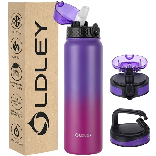 OLDLEY Vattenflaska i rostfritt stål med sugrör 1 l, isolerad flaska med 3 lock, stor termosflaska 1 liter läckagesäker håller dig varm kall för sport gym camping cykel (lila rosor, 3 lock)