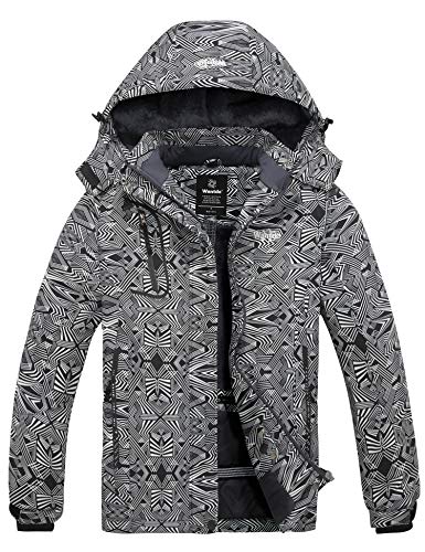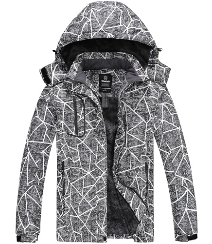 Wantdo Varm skidjacka för kvinnor med fleece, vattentät snowboardjacka, med huva, bergsrock, vindtät regnrock, Grå flora, S