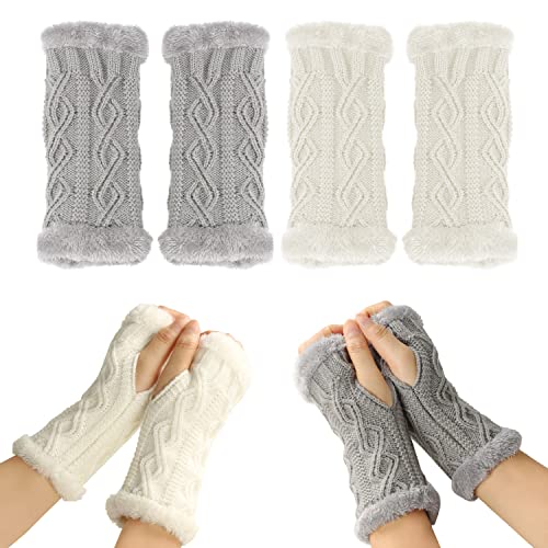 PFLYPF 2 par fingerlösa damhandskar, vintervarma ärmar, plyscharmvärmarärmar, korta stickade handskar, vintersporthandskar, varma, mjuka och tjocka, lämpliga för vintern (vita, grå), Vit, Länge