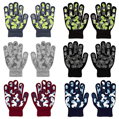 TAGVO Varma stickade handskar för småbarn – 6 par, magiska handskar för pojkar och flickor, barn vinter hela fingrar lysande vantar, skelettpumpamönster, halloween uppklädning, åldrad 4-10,