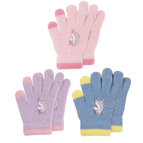 QKURT 3 par varma stickade handskar för barn, färgglada kristallsandhandskar mjuka termiska handskar barn helfinger-vantar med nytt enhörningsmönster för flickor i åldern 3–5 år, flerfärgad, En