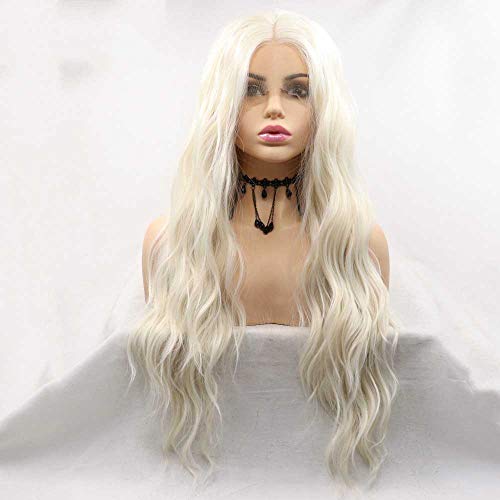 Xiweiya peruker platina blond 60 # färg vit blond syntetisk spets framsida blond våg hår peruk värmebeständig fiber långa vågiga peruker (60#)