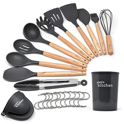 Joejis set med 25 köksredskap, köksredskap, grå, silikon, värmebeständig, köksredskap, trä