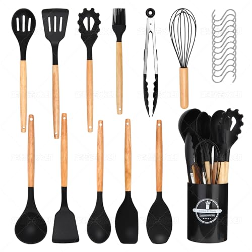 Köksredskapsset i 24 delar, köksredskap: Non-Stick värmebeständig silikon köksredskap – stekspade köksredskap med trähandtag 12 S-krokar, svart