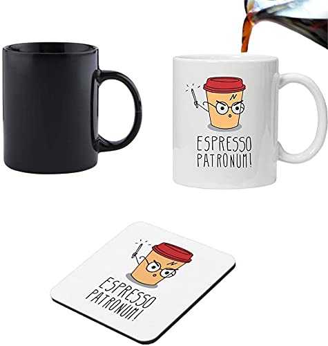 Magisk mugg med motiv "Espresso Patronum" av Harry Potter, med underlägg, värmekänslig, svart