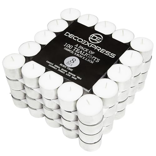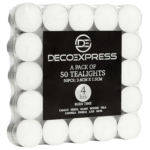 DECO EXPRESS Värmeljus multipack - paket med 100 eller 50, 8 timmar eller 4 timmars brinntid - vita värmeljus oparfymerade (50-4 timmar)