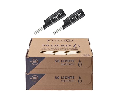 EDZARD Set 100 Värmeljus (8 Timmar) Vit, Tillverkad av Paraffin Plus 2 Minitändare - För Värmeljusglas, Nattlampor Inkl. Tändare - Ljus