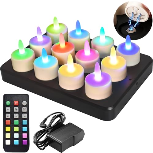 Idyl light uppladdningsbara LED-värmeljus med fjärrkontroll, 55 flimrande timmar brinntid, vattentäta flamlösa ljus med timerfunktion för fest familj heminredning, 12 stycken, RGB