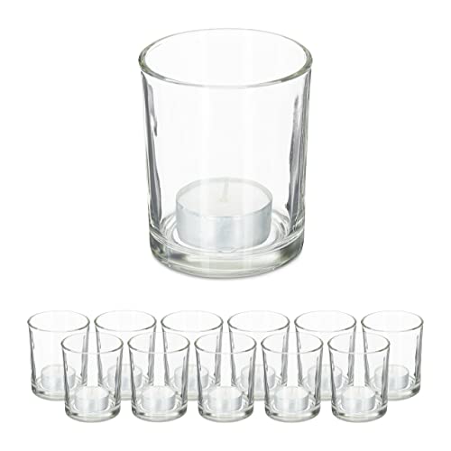 Relaxdays värmeljusglas, set om 12, värmeljushållare av glas, enkla votivglas, H x D: 8,5 x 7 cm, dekoration, transparent