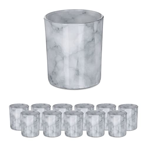 Relaxdays Värmeljusglas, set om 12, värmeljushållare av glas, enkelt marmorutseende, H x D: 8,5 x 7 cm, dekoration, vit/grå