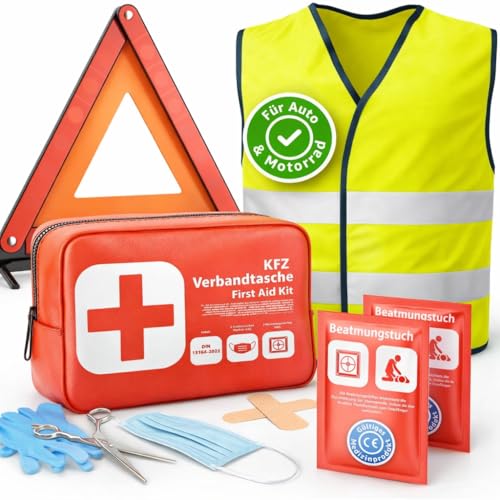 Första hjälpen-låda, första-hjälpen-väska, varningstriangel, högsynlighetsväst, röd första hjälpen kombinationsväska, första hjälpen i enlighet med DIN 13164 + ECE varning triangel + EN